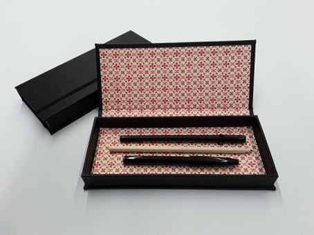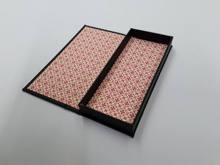 Die Stiftebox ist von innen mit italienischem Buntpapier in einem klassischen roten Muster ausgeklebt.