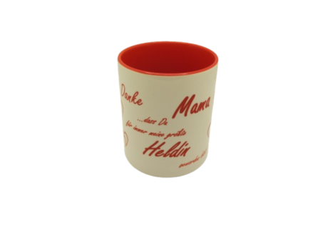 Über diese liebevoll gestaltete weiße Keramiktasse mit roten Akzenten freut sich garantiert jede Mutter.